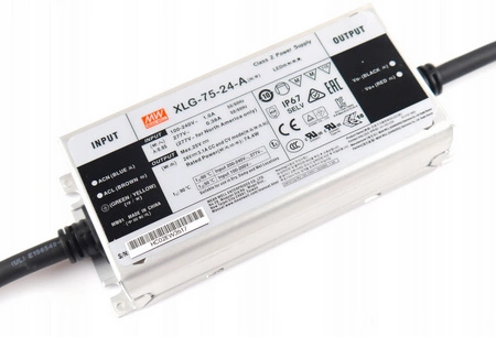The Mean Well XLG-75 series of power supplies are 75-watt constant power LED AC/DC power supplies for indoor and outdoor applications. They feature a wide input voltage range (100-305 VAC), high efficiency of up to 91%, IP67 metal housing and fanless design for quiet and reliable operation in temperatures from -40°C to +90°C. Compliance with international safety standards makes them an ideal choice for professional LED installations worldwide.