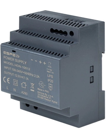 The ESPE-HDN15024 is a high-quality, high-performance switching power supply in a plastic enclosure for mounting on a 6U wide DIN TS35 mm rail. Its design is based on high-quality electronic components that allow for continuous, long-term operation. It is reliable, fully protected and stable. It provides high efficiency and excellent technical performance. The perforated housing provides good ventilation and the trimmer allows accurate voltage adjustment to compensate for voltage drop across the leads. Dual output terminals make it easy to connect loads.